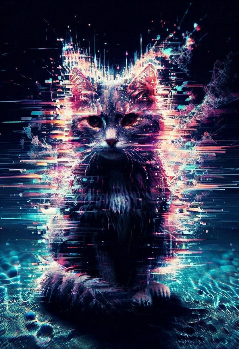 double exposure effect of (((cat silhouette))) , through cat silhouette we see image of underwater sparkling amethyst crystals coral reef shaped xmas tree glowing bright, water is violet color, straight lines and solids, (((warm colors))), green, intricate details, a vibrant digital illustration, dribbble, quantum wavetracing, behance hd, vivid colors, flat color, 2D, strong lines, centered composition,glitch, flickering, digital, glitch style