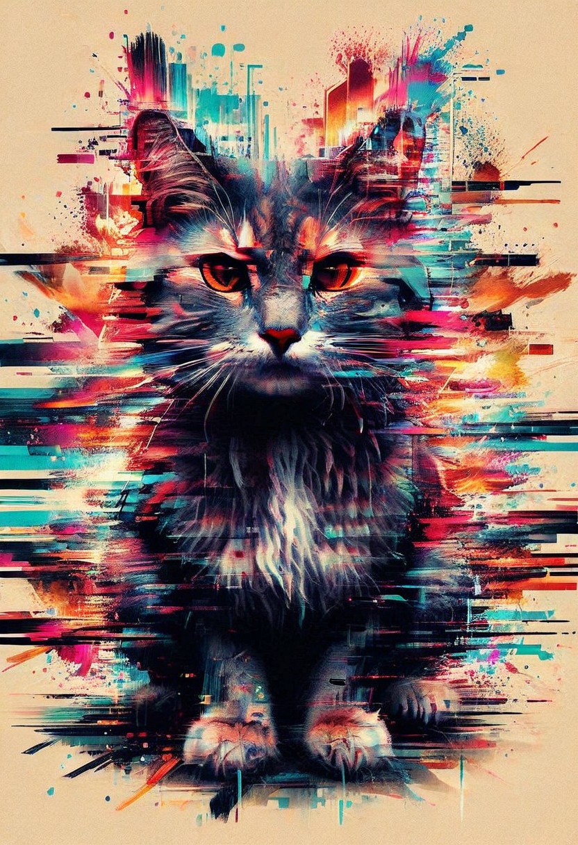 Ink Dripping Drawing, Graffiti Art Style, colorful streams of smoke, cute cat face silhouette without body, symmetry, (((warm colors))), intricate details, background colorful cloud streams with smooth lines and curves, dynamic, dramatic, vibrant colors, graffiti art style, ink drawing, dripping ink,glitch, flickering, digital, glitch style