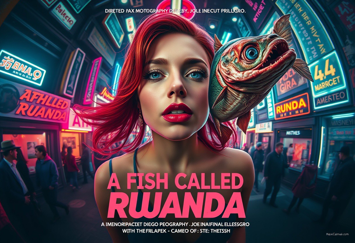 **“A captivating and surreal movie poster for A Fish Called Ruanda, a futuristic B-movie thriller with a girly, campy twist. The scene is viewed through the exaggerated distortion of a fish-eye 12mm cinema prime lens, pulling the viewer into the chaotic, neon-soaked dystopian cityscape. Front and center is the main actress, Katarina Pesceallegro, a striking redhead with a mix of glamour and danger in her expression. Floating ominously nearby is a grotesque, decaying fish, symbolizing the ‘very rotten climax.’ The poster includes bold, retro-futuristic typography for the title A Fish Called Ruanda, with the subtitle in Polish beneath it. The credits at the bottom feature: • Directed by: Max Morrison • Director of Photography: Diego Dalla Luce • Edited by: JOE “FINAL CUT” Switcho • Main Actress: Katarina Pesceallegro • Co-Starring: JOE FISH • With the Cameo of: STEWEN SEAGULL The design blends neon tones, gritty textures, and campy B-movie flair, making it a trendsetting cinematic experience that teases its quirky, action-packed storyline.”**