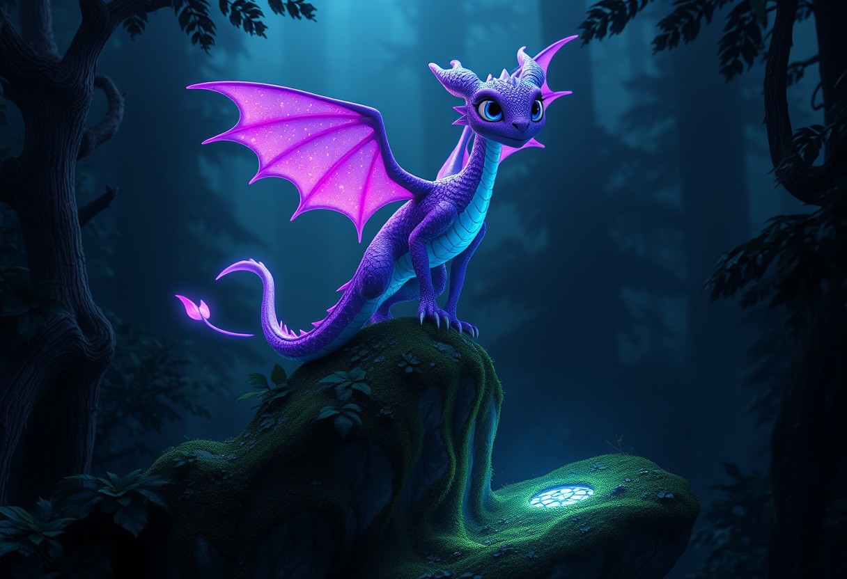 A Pixar-style medium shot of a nocturnal forest with a shadowy atmosphere. The forest is illuminated by a neon glow from a fantastical, ethereal violet, dragon with translucent scales. The dragon's scales shimmer with a blend of vibrant purple and electric blue, casting an otherworldly light upon the surrounding foliage. The dragon has large, expressive eyes filled with flirtatious mirth, curiosity and delicate wings that resemble gossamer fabric. The dragon's body is adorned with tiny, sparkling dots that dance and flicker. The dragon stands atop a mossy, luminescent high cliff, , and its reflection shimmers in the dew-kissed mountian. The contrast between the dragon's radiant colors and the deep, inky blackness of the forest creates a breathtaking visual spectacle.