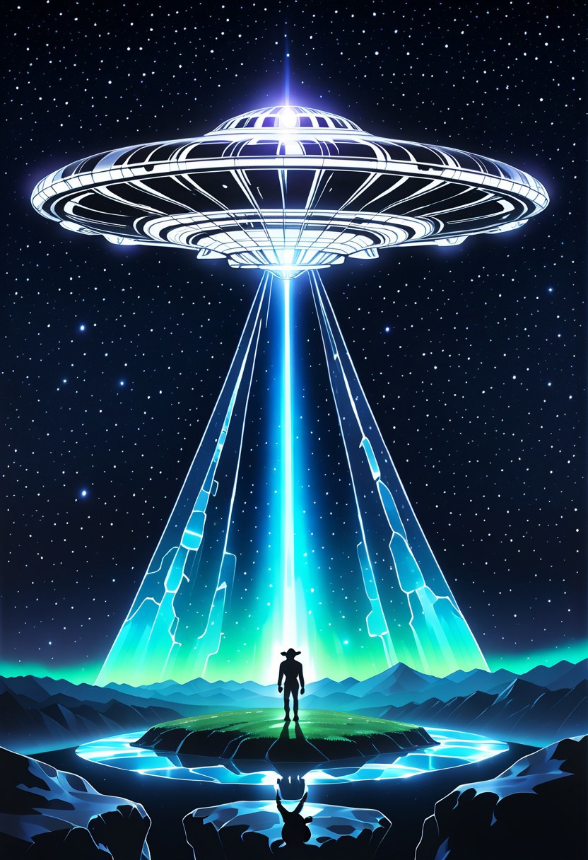 (masterpiece), best quality, Anime, Illustration, hex, cut lines, Magic, Reflection, ufo, flying ufo, alien, (Cow Abduction:1.5), Black Background, No Humans, Starry Theme, (Light Refraction), White and colorfull Theme, Natural Lighting, Verynsty, fluorite mineral, flu0rite, iridiscent, symphtia-style