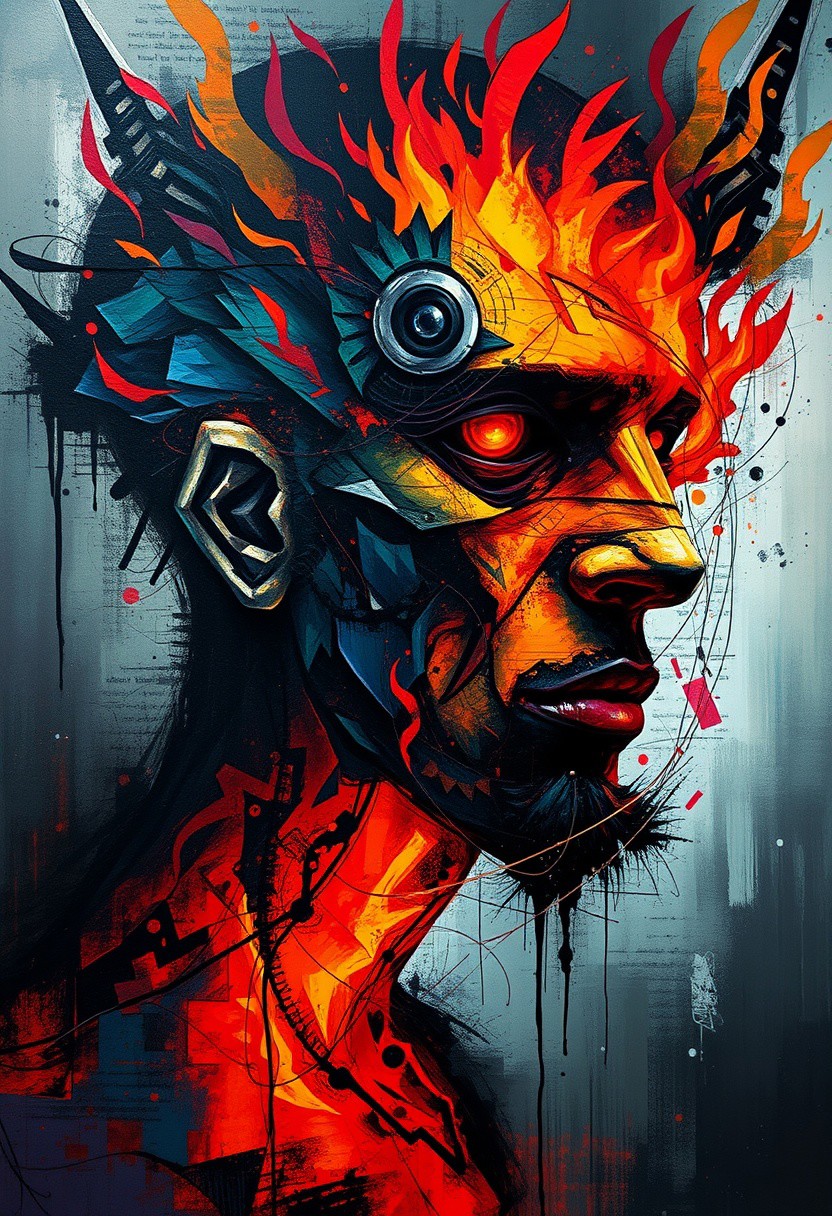 A beautiful dark chaotic mind of fire and mayhem, wicked thoughts, by Yossi Kotler, Geometric cubism portrait, vivid