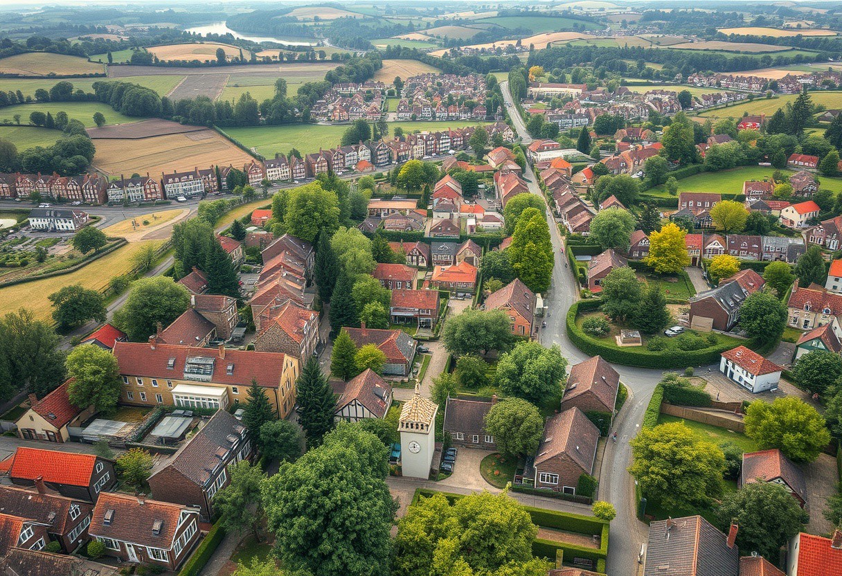 distant bird's eye view of a city, rolling hills, narrow brick streets, lots of trees, townhouses, apartments, mix of housing types, arts and crafts, art deco, small lakes in town, tree lined streets, narrow canals along streets, houses next to the street, large backyards, orchards in backyards, hedgerows divide properties, upto 4 story tall buildings, hyperrealism, beautiful, colorful, central city plaza, clock tower at plaza, town surrounded by farms, intricate, extreme detail, 12k, masterpiece, intricate, vray, nvdia ray tracing, cryengine, in style of jean-claude golvin, people walking, people on bikes,