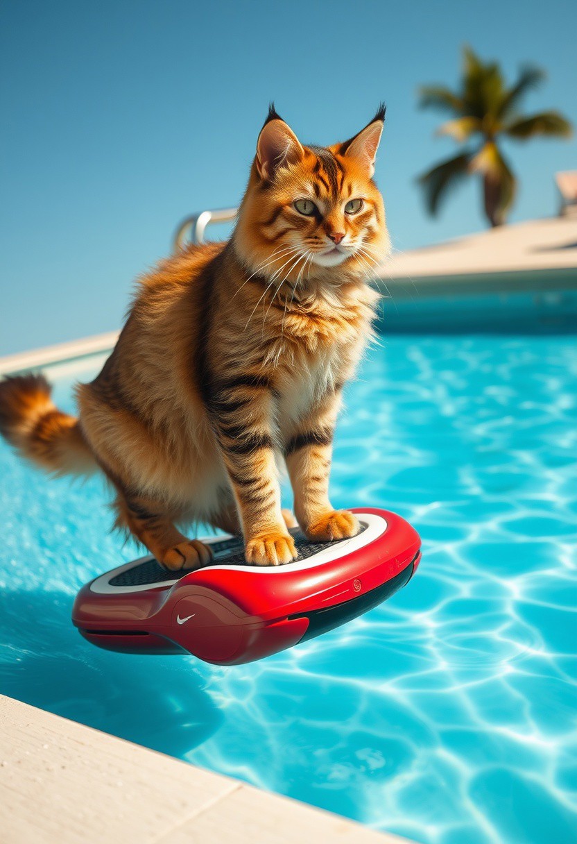 a sexy cat furry riding on a hoverboard above a swimming pool, leaving a cool water trail