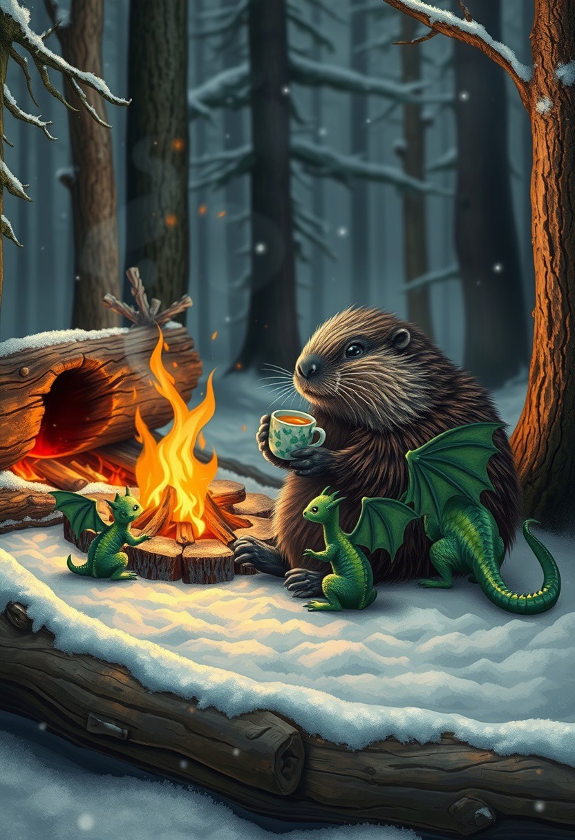 Realistic beaver sitting nearby fallen tree next to a big campfire and eating a sandwich with cheese and holding a cup of tea, sitting with a group of little green dragons with dark green wings , with details, snow, snowy, winter forest, vivid colors, details seen under an electron scanning microscope