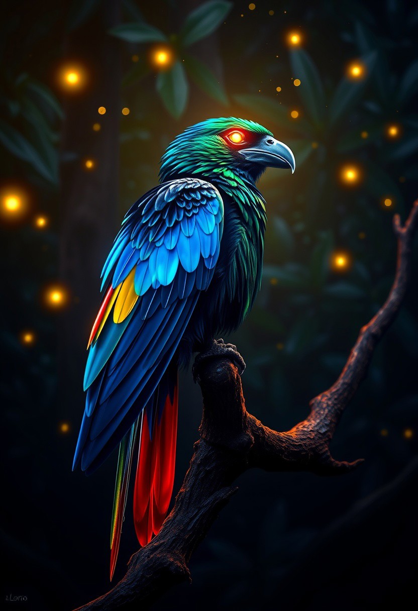 <lora:DGLO_style_v.7:0.85> DGLO style. A majestic crow perched on a gnarled tree branch in a dark mystical forest, its sleek feathers glowing vibrantly like bright diamond. (The birdas plumage radiates with shimmering hues of electric blue, emerald green, and vivid yellow and big red tail feathers, casting a bright glow onto the surrounding foliage and branches). The crows glowing eyes emit a warm golden light, creating a piercing yet tranquil presence against the dark background. Fireflies drift lazily in the air, their faint light complementing the crow's radiant feathers. The background features dense, dark jungle vegetation. Almost black night sky scattered with tiny stars. Camera angle: a close side profile of the parrot, with a blurred, dreamy forest as its backdrop, emphasizing its neon brilliance.