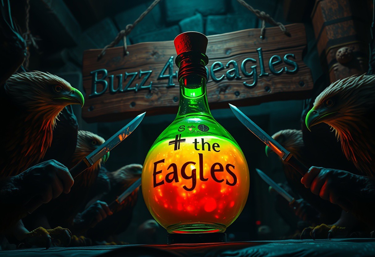 “An action shot of a vibrant blob-like creature that resembles a mysterious glass vial filled with magical glowing green liquid, topped with a cork. The scene is captured with a cinematic 12mm cinema-grade lens, creating a dynamic, dramatic perspective. The creature is surrounded by thrill-inducing eagles wielding knives, adding an adventurous and surreal twist. A medieval-style wooden sign reading ‘Buzz 4 the Eagles’ hangs prominently in the scene, with aged, engraved lettering. The setting is intense and vibrant, evoking a high-stakes atmosphere akin to an action-packed Antonio Banderas movie. Lighting emphasizes the glowing green liquid, with dramatic shadows enhancing the tension of the scene.”