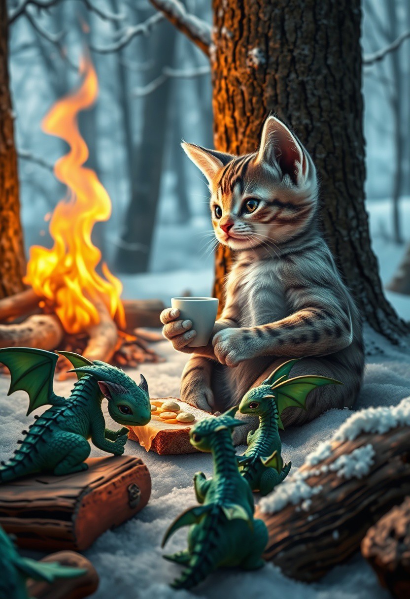 a muscular kitten with visible veins sitting nearby fallen tree next to a big campfire and eating a sandwich with cheese and holding a cup of tea, sitting with a group of little green dragons with dark green wings , with details, snow, snowy, winter forest, vivid colors, details seen under an electron scanning microscope