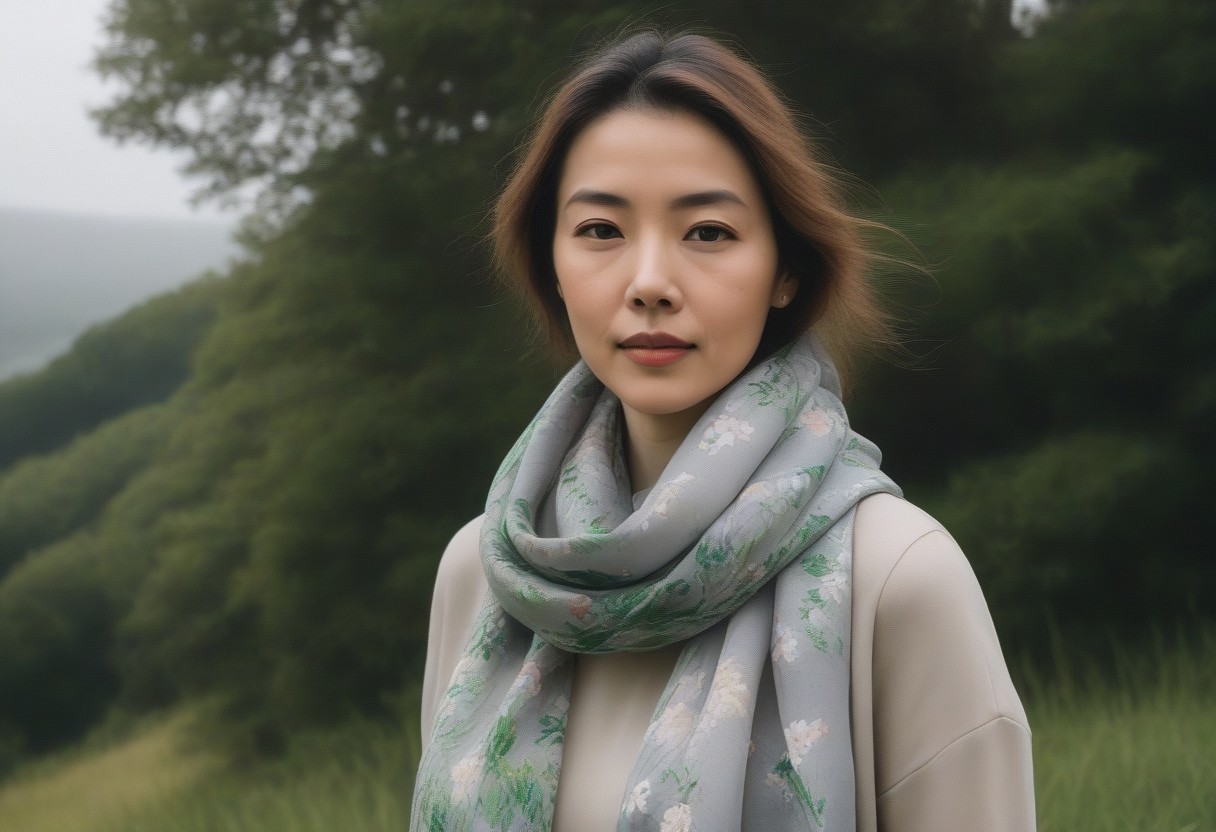 The image features a woman wearing a floral-patterned scarf, which drapes elegantly around her neck and shoulders. She has a calm expression and appears to be in a natural setting, with vibrant green grass and foliage in the background. The sky is overcast, suggesting a soft, diffused light. She is dressed in a light grey top, and the overall mood of the photo conveys a sense of tranquility and connection with nature.