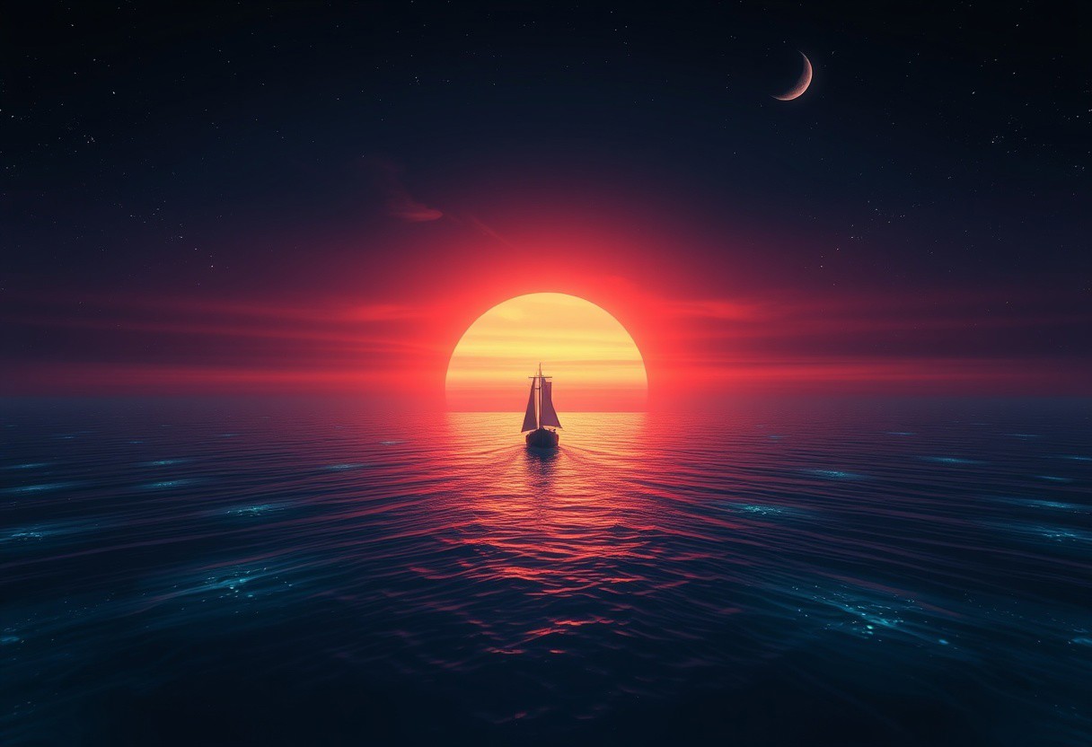A majestic cinematic shot frames the lone ship gliding across the deep blue ocean, against the breathtaking backdrop of a fiery orange-pink sunset dissolving into inky blackness. The crescent moon casts a soft glow, illuminating the bioluminescent water's shimmer. The vast ocean and celestial sky evoke tranquility, wonder, and awe, while the solitary ship adds mystery and adventure, inviting the viewer to embark on a fantastical journey across the starry sea.