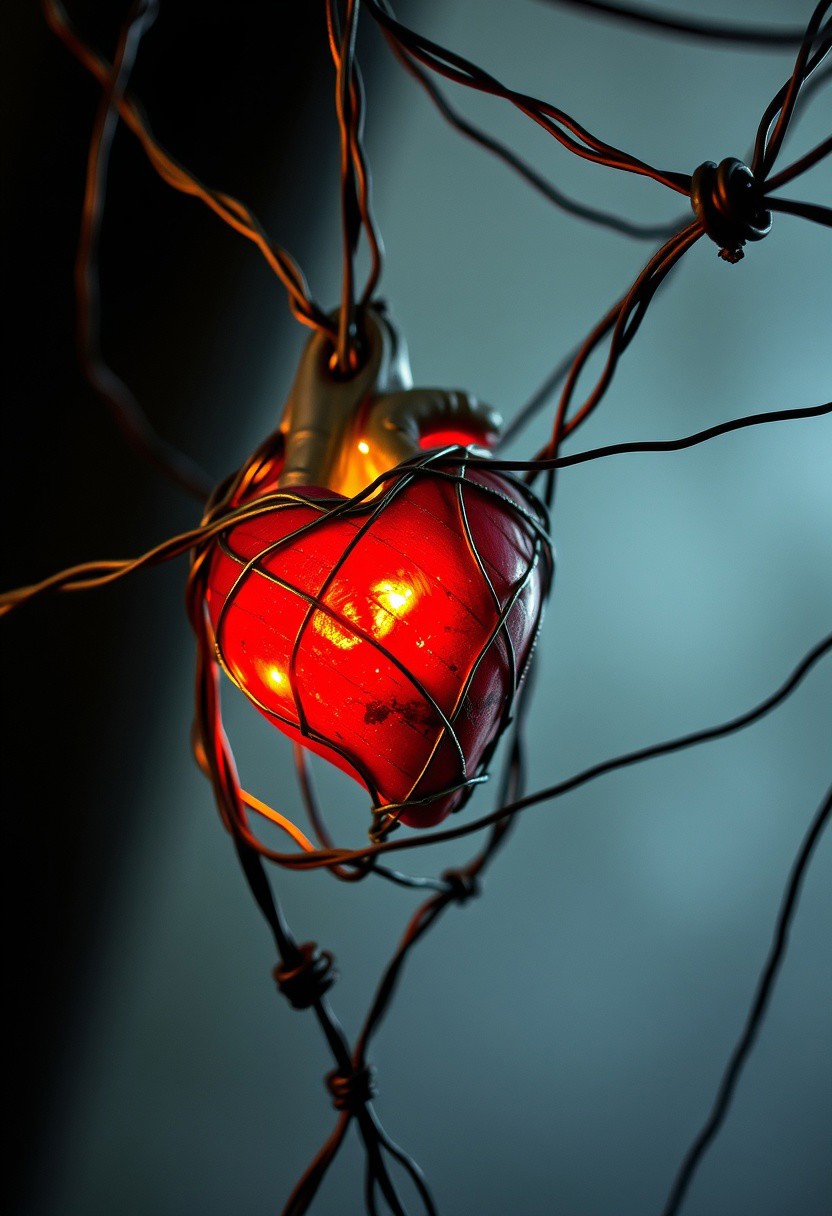 Bound in wires, a heart still glows, A spark of love where darkness flows. Metal and soul, a fragile weave, In steel's embrace, dreams still believe.