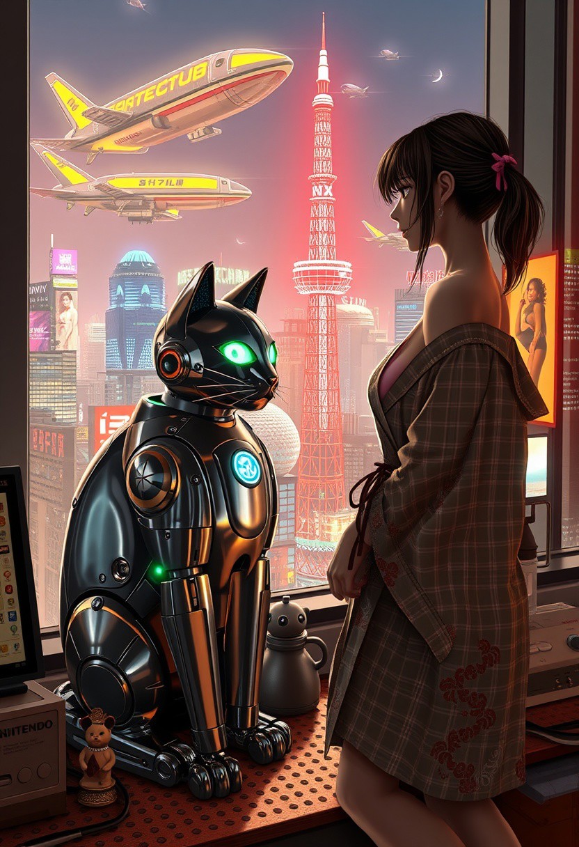 Shiny Metal Mechanical Robot Cat with glowing green blue eyes sits on a cluttered metal riveted desk next to a maneki neko statue and a small Nintendo , the robot cat is looking out to a floor to ceiling window that looks out over a futuristic cyberpunk Tokyo skyline with skyscrapers, holographic advertisements, futuristic airships covered with lights and advertisements in Japanese, a space elevator, (((a tall thin beautiful young woman, 22 years old, is standing next to the cat looking out at the city through the window))), The woman is dressed in an ornate Japanese style bath robe, exposing some cleavage and her lower legs. The woman's hair is messy from just waking up and tied up with a ribbon. Artistic cyberpunk, dynamic perspective, a translucent neon projection of a strip club bar advertisement displaying a partially dressed woman is visible on a nearby building,