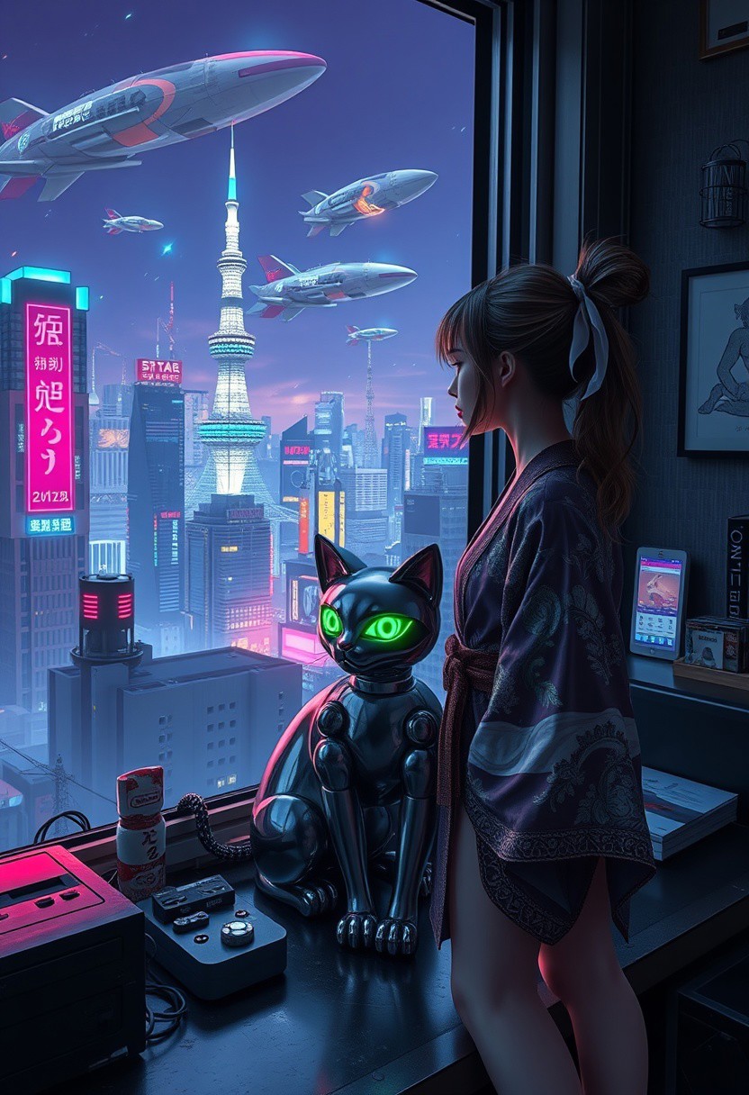 A small highly detailed Shiny Metal Mechanical Robot Cat with glowing green blue eyes sits on a cluttered metal riveted desk next to a maneki neko statue and a small Nintendo , the robot cat is looking out to a floor to ceiling window that looks out over a futuristic cyberpunk Tokyo skyline with skyscrapers, holographic advertisements, futuristic airships covered with lights and advertisements in Japanese, a space elevator, (((a tall thin beautiful young woman, 22 years old, is standing next to the cat looking out at the city through the window))), The woman is dressed in an sexy ornate Japanese style bath robe, her lower legs are visible. The woman's hair is messy from just waking up and tied up with a ribbon. Artistic cyberpunk, dynamic perspective, a translucent neon projection of a strip club bar advertisement displaying a partially dressed woman is visible on a nearby building,