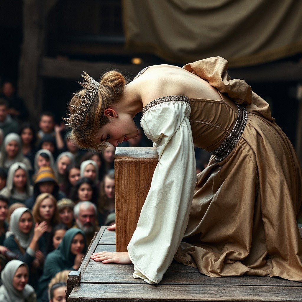 Medieval Queen, on knees, leant forward to place head on a block of wood with room for her neck, which rests on the wooden block, on a wooden platform. crown, elegant gown, hair up, bare neck. her dress is raised at back, exposing her rear, crowd of outlooks below platform level, dressed in medieval garb.