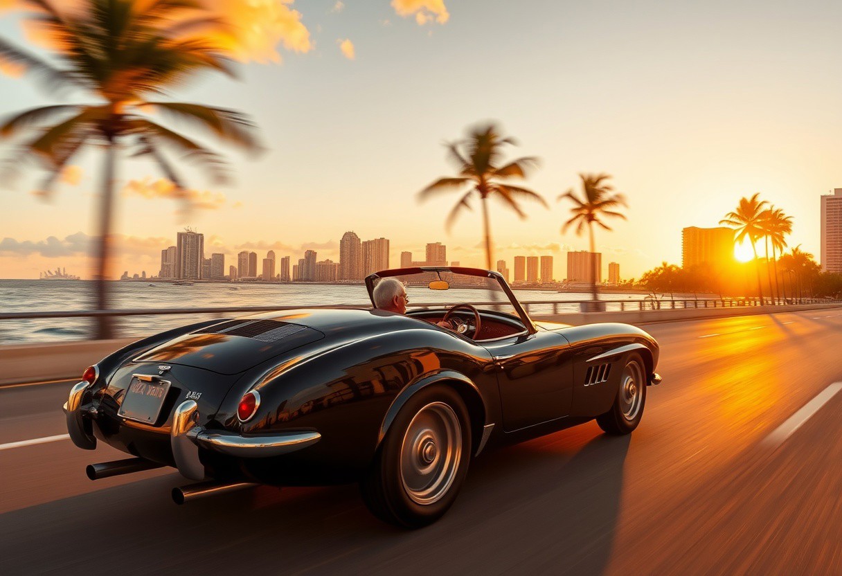 Panoramic shot of a gleaming black vintage sports car gliding along Miami Beach's coastal highway at sunset. Golden highlights dance across its glossy finish as the ocean's molten gold surface meets the fading light. Retro skyline silhouettes rise in harmony with golden hues, while neon accents pulse softly in warm amber tones. Palms sway gently, their fronds embracing the sun's final rays, casting a nostalgic ambiance. The driver, carefree and joyful, relishes the experience as the setting sun dips below the horizon.