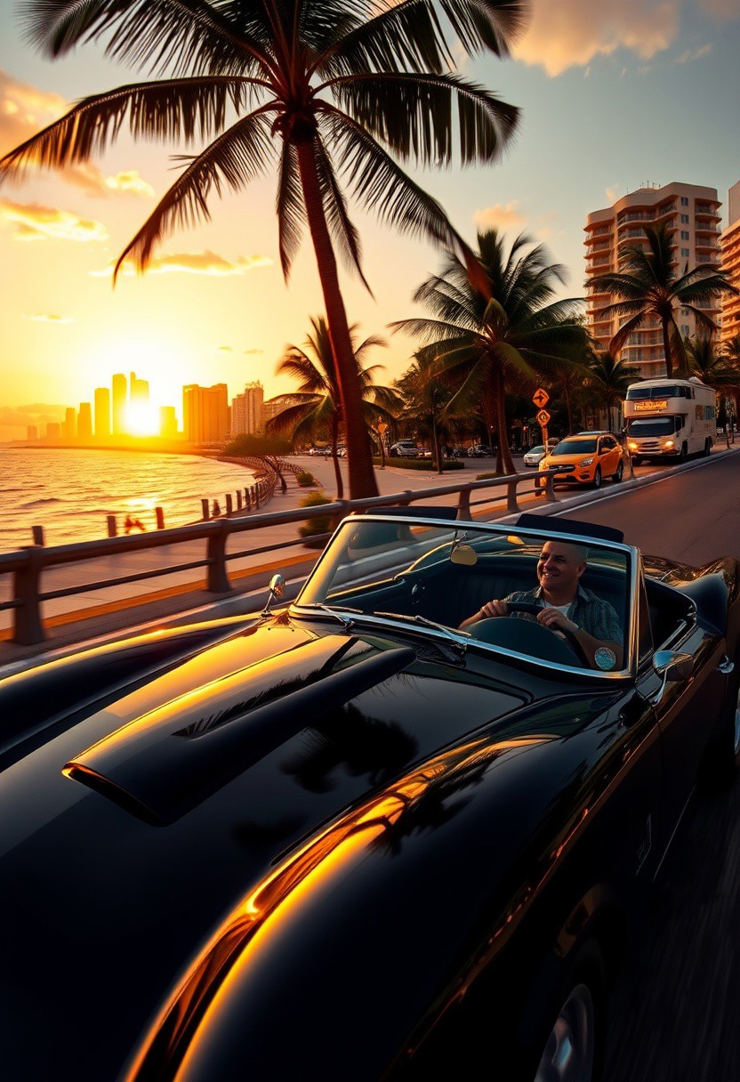 Panoramic shot of a gleaming black vintage sports car gliding along Miami Beach's coastal highway at sunset. Golden highlights dance across its glossy finish as the ocean's molten gold surface meets the fading light. Retro skyline silhouettes rise in harmony with golden hues, while neon accents pulse softly in warm amber tones. Palms sway gently, their fronds embracing the sun's final rays, casting a nostalgic ambiance. The driver, carefree and joyful, relishes the experience as the setting sun dips below the horizon.