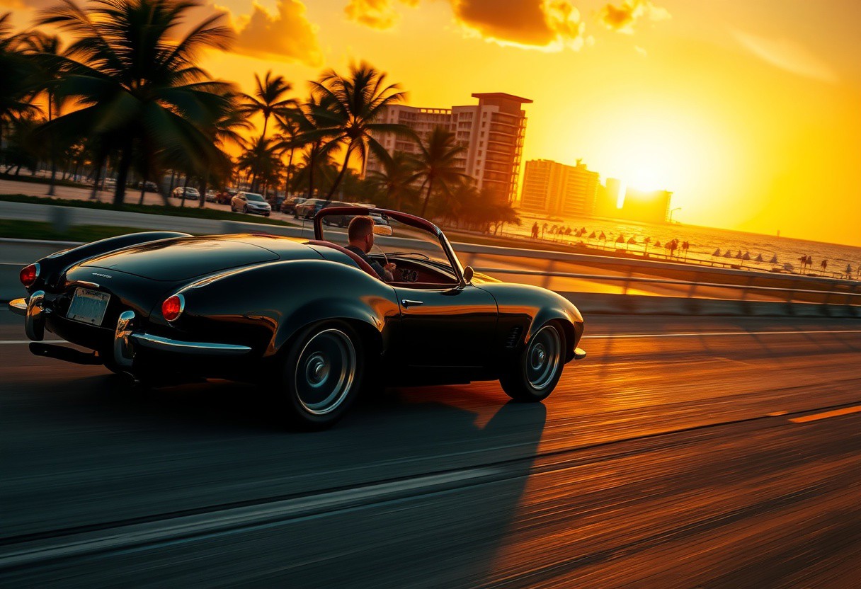 A sweeping shot of a sleek vintage sports car, its glossy black finish radiating golden highlights as it cruises along the Miami Beach coastal highway at sunset. The ocean glistens like molten gold beneath the fading light, with the retro skyline rising in the background - a radiant blend of gold and shadowy silhouettes. Neon accents pulse softly in warm amber tones, harmonizing with the golden horizon. Palms sway gently, their fronds catching the sun's final rays, casting a dreamy, nostalgic ambiance. The driver, carefree and joyful, savors the experience as the setting sun dips below the horizon.