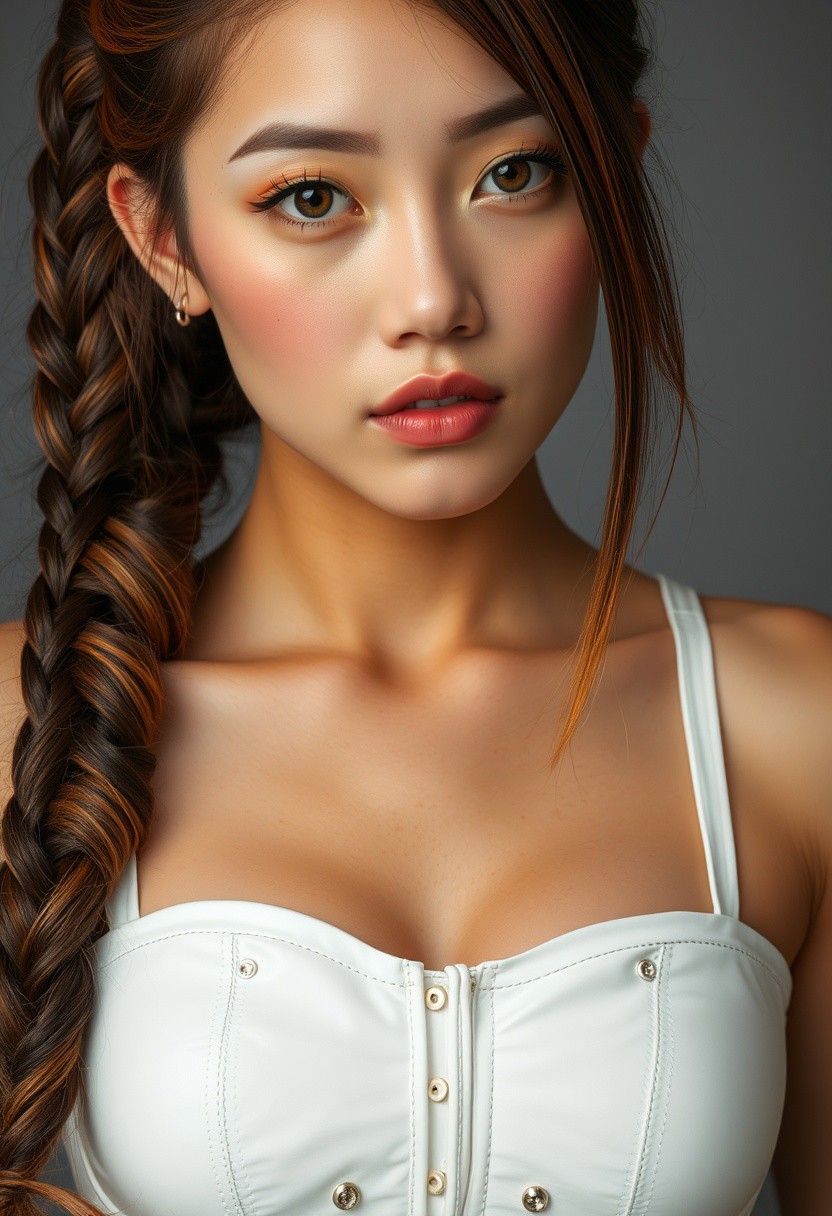 score_9, score_8_up, score_7_up, score_6_up, score_5_up, score_4_up, 1woman, , RAW photo, (freckles:0.8), long braided top ponytail, Brunette hair with orange tips, medium close-up shot front view, White latex corset (busty 44d:1.5), extremely detailed, beautiful detailed neon orange speckled eyes, full lips, almond skin, neutral expression, neutral gray background, studio lighting , in the style of (kyuYong Eom:1.0)