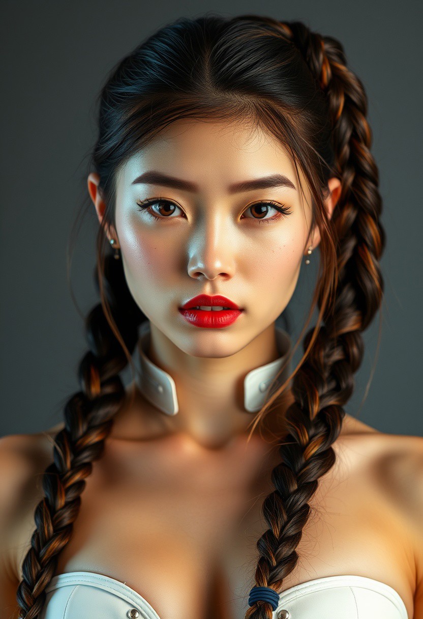 score_9, score_8_up, score_7_up, score_6_up, score_5_up, score_4_up, 1woman, , RAW photo, (freckles:0.8), long braided top ponytail, Brunette hair with orange tips, medium close-up shot front view, White latex corset (busty 44d:1.5), extremely detailed, beautiful detailed neon orange speckled eyes, full lips, almond skin, neutral expression, neutral gray background, studio lighting , in the style of (kyuYong Eom:1.0)