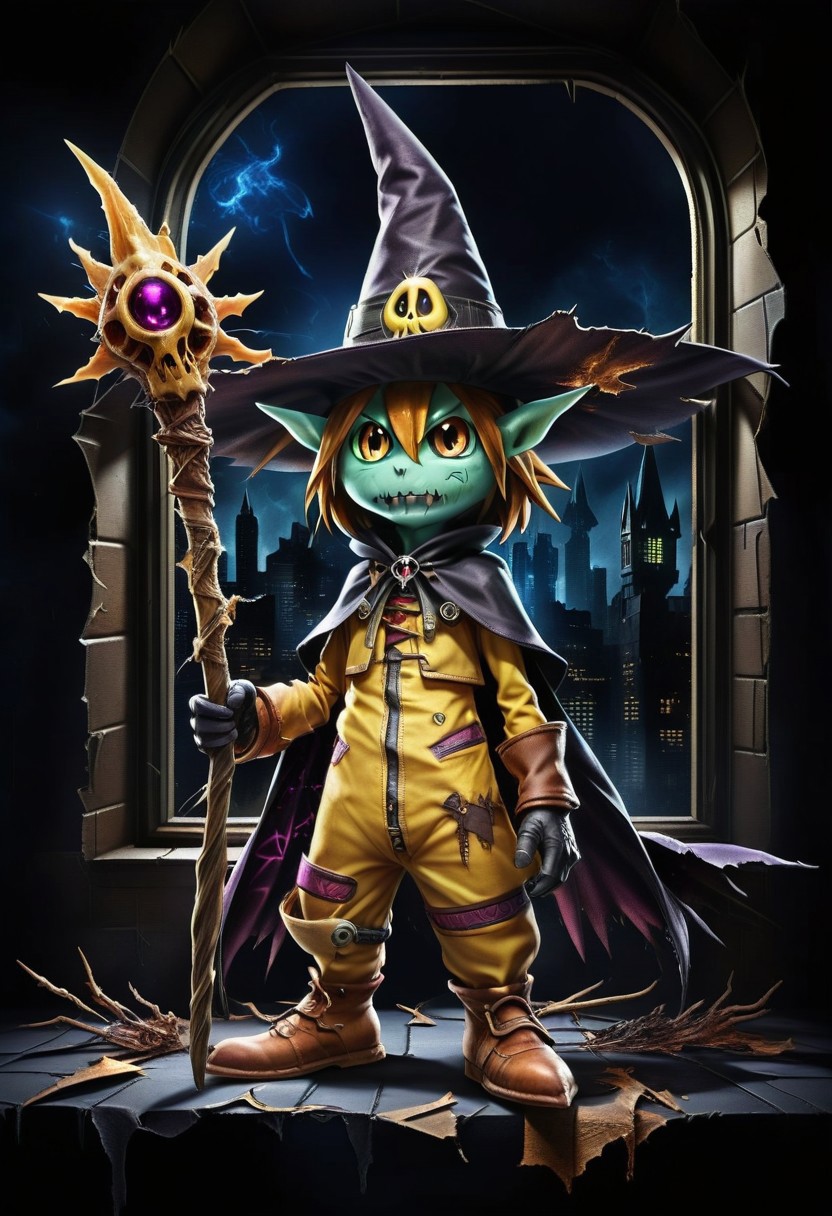 Wizardmon, witch hat, brown footwear, gloves, torn clothes, black background, top view, digimon (creature), holding staff, pointy ears, window, 1boy, city, scar
