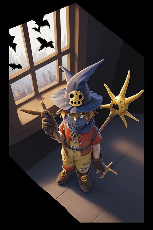 Wizardmon, witch hat, brown footwear, gloves, torn clothes, black background, top view, digimon (creature), holding staff, pointy ears, window, 1boy, city, scar