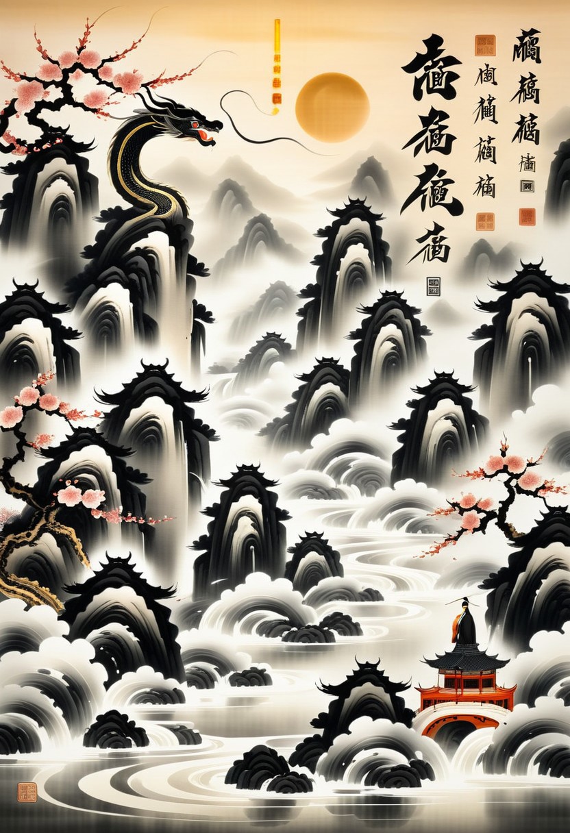 Sinoink, traditional_chinese_ink_painting, calligraphy, glowing_text, mystical_aura, black_serpent, coiled_snake, polished_scales, obsidian_snake, dynamic_brushstrokes, towering_structure, mystical_tower, celestial_dragon_carvings, glowing_runes, swirling_mist, hazy_background, cherry_blossoms, scattered_petals, intricate_patterns, ethereal_light, dreamlike_atmosphere, ancient_mystery, power_aura, soft_shading, ink_wash_art, high_contrast