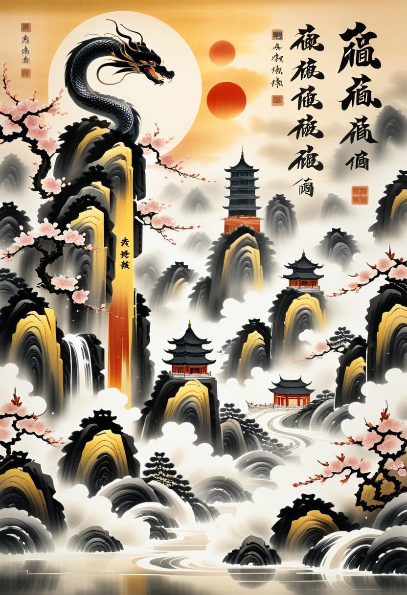 Sinoink, traditional_chinese_ink_painting, calligraphy, glowing_text, mystical_aura, black_serpent, coiled_snake, polished_scales, obsidian_snake, dynamic_brushstrokes, towering_structure, mystical_tower, celestial_dragon_carvings, glowing_runes, swirling_mist, hazy_background, cherry_blossoms, scattered_petals, intricate_patterns, ethereal_light, dreamlike_atmosphere, ancient_mystery, power_aura, soft_shading, ink_wash_art, high_contrast