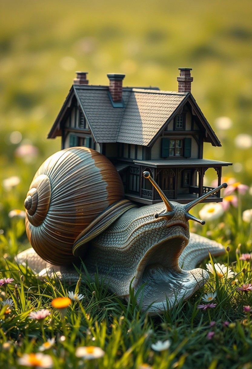 cinematic photo <lora:aidmaFluxPro1.1Stylev0.2:1> aidmafluxpro1.1, A photograph of a massive, sluggish snail with a glossy, slimy skin texture and tiny, beady eyes, carrying a full-sized, intricately detailed Victorian-style house on its back instead of a shell. The house, complete with chimneys, windows, and a delicate porch, appears to be perfectly intact and proportional to the snail's enormous body. The snail's foot, leaving a trail of silvery slime, is firmly planted on the ground, as if it's posing for the camera. The lighting is soft and warm, with a hint of morning dew, casting a gentle glow on the entire scene. The atmosphere is whimsical and surreal, with a touch of fantasy. The background is a lush, green meadow with wildflowers of various colors, adding a sense of serenity to the bizarre scene. The image is highly detailed, with a shallow depth of field, emphasizing the textures of the snail's skin and the house's intricate architecture. The color palette is vibrant, with earthy tones of green, brown, and beige, accented by the soft pastels of the wildflowers. 8k highest resolution with sharp intricate details. Hyperrealistic, detailed, and vivid. . 35mm photograph, film, bokeh, professional, 4k, highly detailed