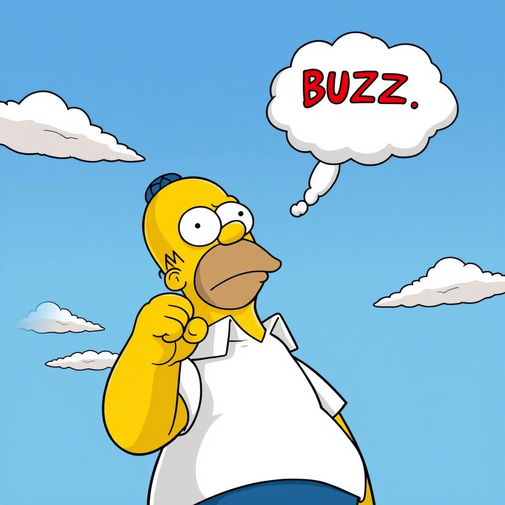 Homer Simpson, simpsons, comic style, clenched fist, looking up, cloud, blue sky, text in cloud „BUZZ“