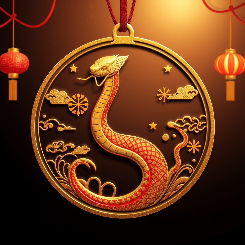 Generate a medal with the theme of “Snake Year Spring Festival,” and the design should meet the following criteria: Theme-appropriate design: The central focus of the medal should feature a beautifully and smoothly designed snake representing the Snake zodiac year. It can incorporate traditional Chinese cultural elements, such as clouds, lanterns, couplets, firecrackers, etc., to reflect the festive atmosphere of the Spring Festival. Reflect the UI style of the site "hdkyl": Please refer to the UI design style of the site "hdkyl," using a color scheme primarily of red, gold, and yellow. The design should combine simplicity with elegance, presenting a modern yet festive feel that blends technology with traditional holiday elements. No real people, real-world scenes, or AI-generated people: The design should not include any real human figures or real-world scenes. Focus on showcasing the elements of the Spring Festival and the symbolism of the Snake zodiac year, avoiding real-life people or scenes. No inappropriate elements: Avoid any disturbing elements such as blood, horror, pornography, or distorted, unnecessary limbs, and meaningless text.