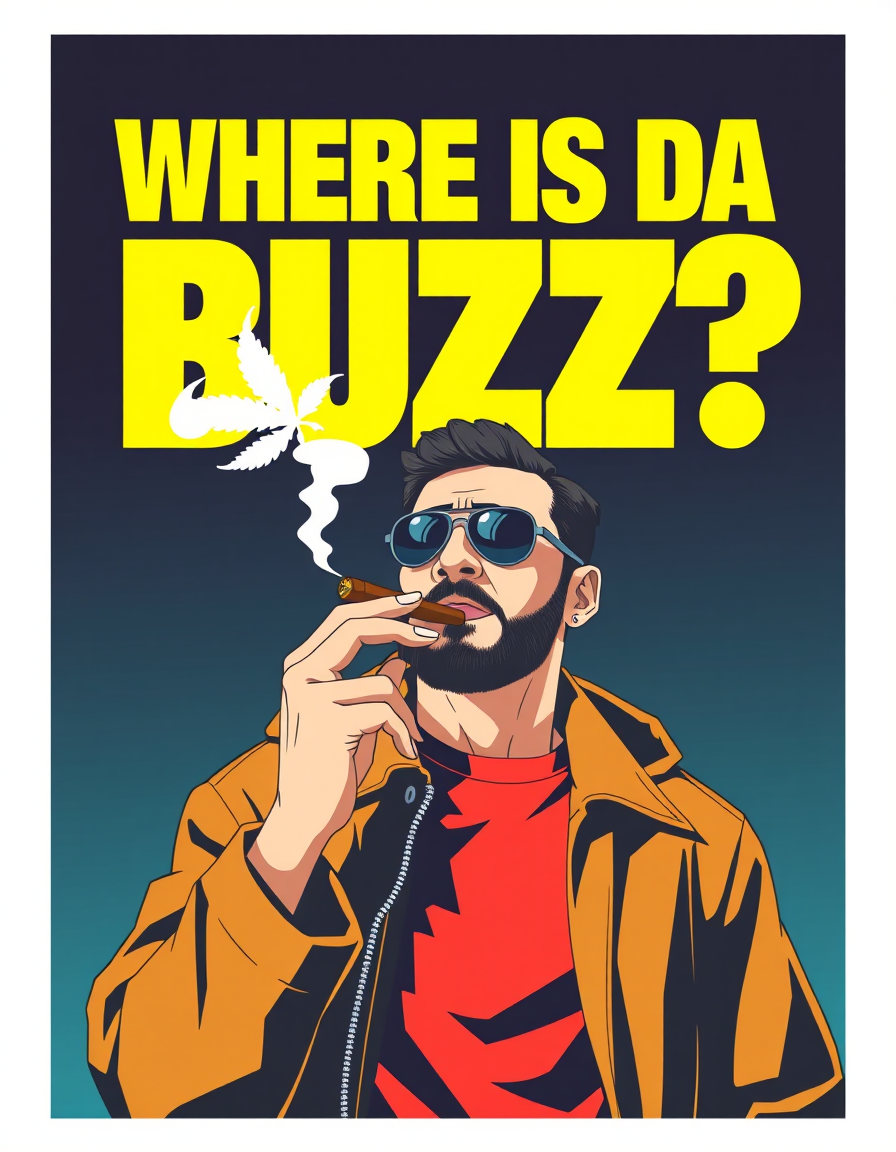 movie poster with BIG BOLD TEXT "WHERE IS DA BUZZ" written at the top with a man smoking marijuana blunt cigar in an anime art styleâââ