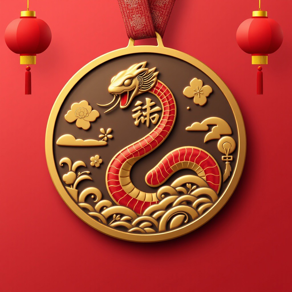 Generate a medal with the theme of “Snake Year Spring Festival,” and the design should meet the following criteria: Theme-appropriate design: The central focus of the medal should feature a beautifully and smoothly designed snake representing the Snake zodiac year. It can incorporate traditional Chinese cultural elements, such as clouds, lanterns, couplets, firecrackers, etc., to reflect the festive atmosphere of the Spring Festival. Reflect the UI style of the site "hdkyl": Please refer to the UI design style of the site "hdkyl," using a color scheme primarily of red, gold, and yellow. The design should combine simplicity with elegance, presenting a modern yet festive feel that blends technology with traditional holiday elements. No real people, real-world scenes, or AI-generated people: The design should not include any real human figures or real-world scenes. Focus on showcasing the elements of the Spring Festival and the symbolism of the Snake zodiac year, avoiding real-life people or scenes. No inappropriate elements: Avoid any disturbing elements such as blood, horror, pornography, or distorted, unnecessary limbs, and meaningless text.
