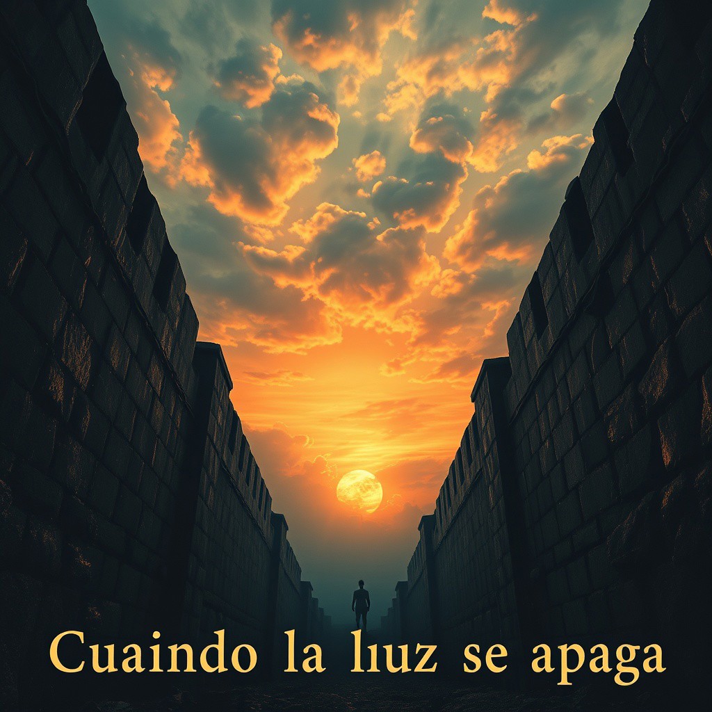 rock album cover for a melancholic rock about prison The walls shake with voiceless echoes, The monsters advance with ferocious gestures. He knows that the dawn will never come, while the gloom begins to bite him.life, , dramatic sunset, view from below, heavy looking determined, album title "Cuando la luz se apaga"