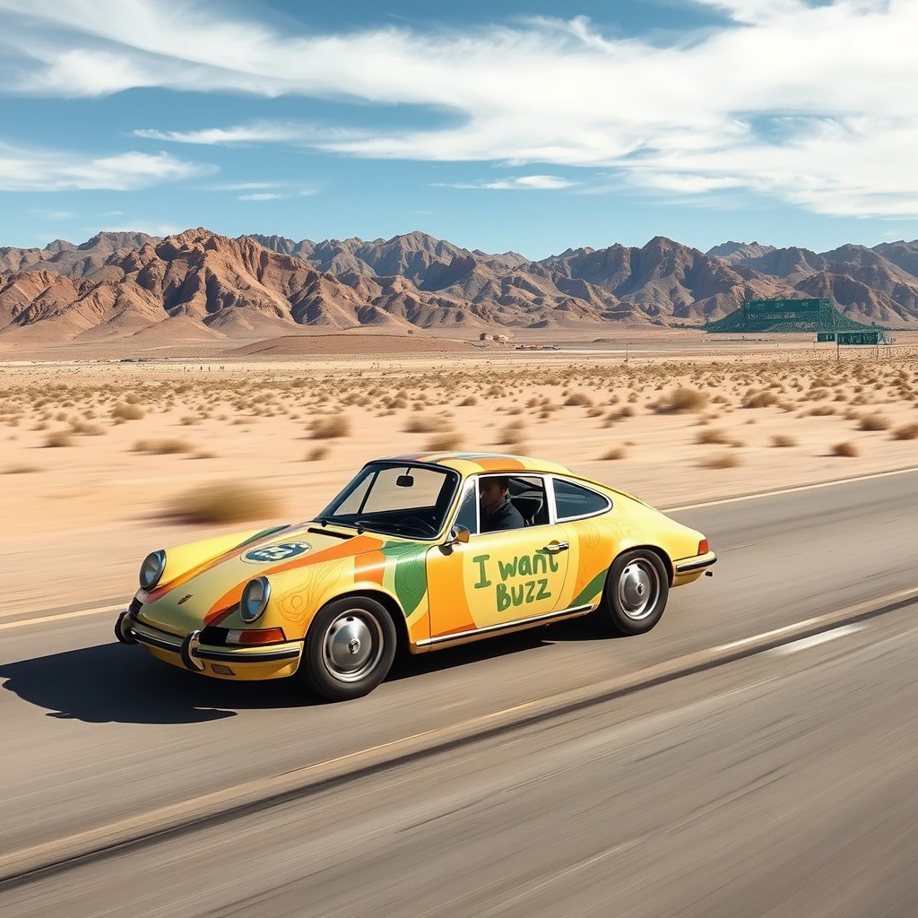 show a classic porsche 911 with a wrap on it saying i want buzz. driving through a dessert highway at high speed.