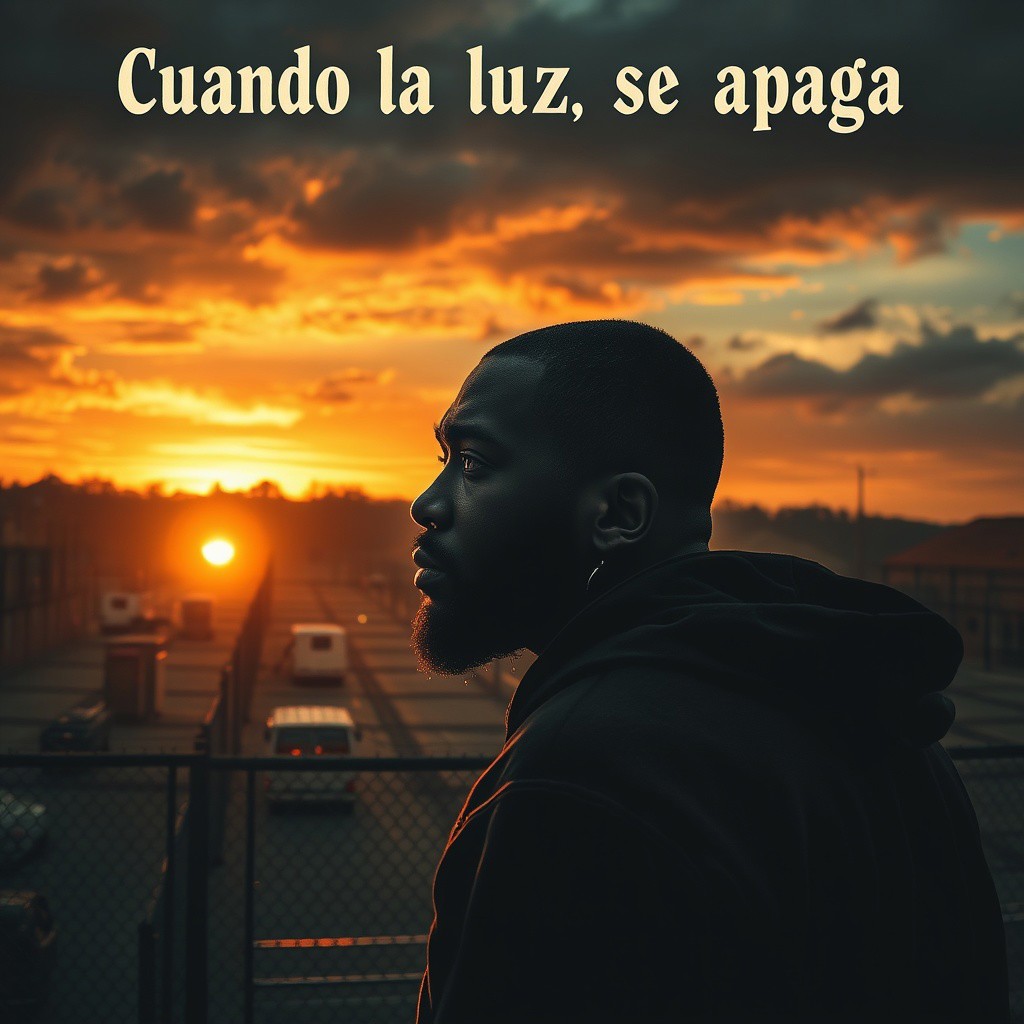 rock album cover for a melancholic rock about prison life, prison yard, dramatic sunset, view from below, rapper looking determined, album title "Cuando la luz se apaga" Las paredes tiemblan con ecos sin voz, los monstruos avanzan con gesto feroz. Sabe que nunca vendrá el amanecer, mientras la penumbra le empiece a morder.