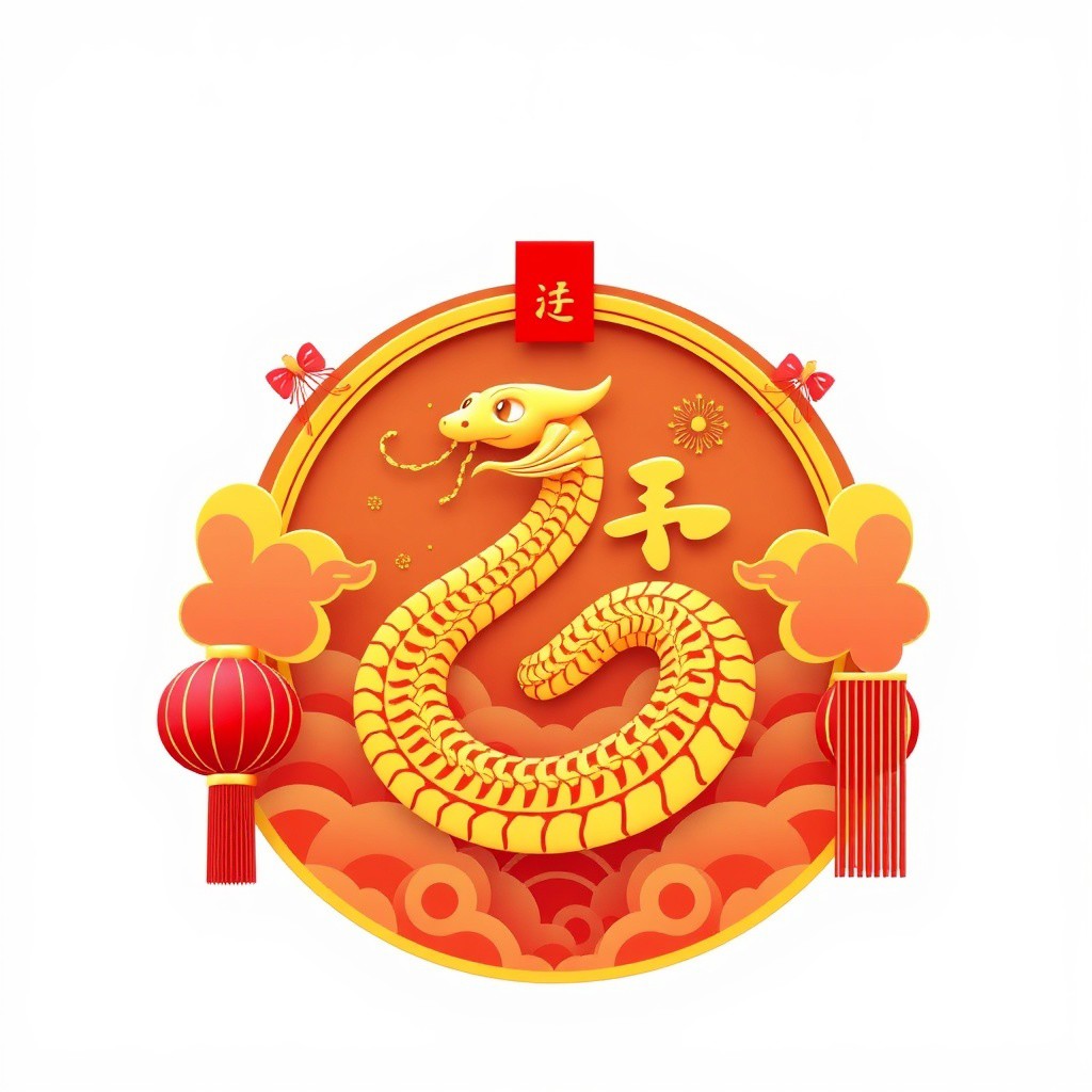 Generate a medal with the theme of “Snake Year Spring Festival,” and the design should meet the following criteria: Theme-appropriate design: The central focus of the medal should feature a beautifully and smoothly designed snake representing the Snake zodiac year. It can incorporate traditional Chinese cultural elements, such as clouds, lanterns, couplets, firecrackers, etc., to reflect the festive atmosphere of the Spring Festival. Reflect the UI style of the site "hdkyl": Please refer to the UI design style of the site "hdkyl," using a color scheme primarily of red, gold, and yellow. The design should combine simplicity with elegance, presenting a modern yet festive feel that blends technology with traditional holiday elements. No real people, real-world scenes, or AI-generated people: The design should not include any real human figures or real-world scenes. Focus on showcasing the elements of the Spring Festival and the symbolism of the Snake zodiac year, avoiding real-life people or scenes. No inappropriate elements: Avoid any disturbing elements such as blood, horror, pornography, or distorted, unnecessary limbs, and meaningless text.