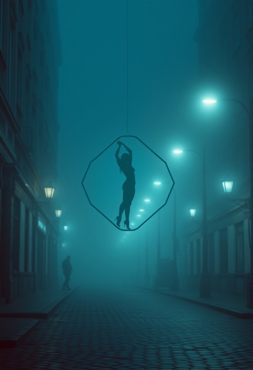 Photograph with rich deep teal tones, gentle soft light, elongated form suspended ethereally, geometric logo design with clean lines and balance, lone figure in misty city street, dim streetlights, foggy atmosphere, wet cobblestones, diffused shadows, subtle illumination, luxurious and vibrant.