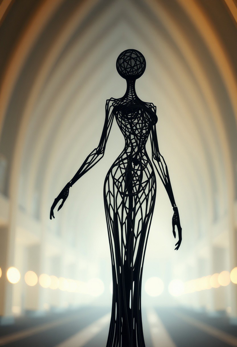 Precise architectural color photograph of an elongated form in an ethereal pose, with a blurred bokeh effect and soft cinematic haze. The image features sharp lines and detailed structures of the subject against a soft-focus, hazy background, creating a balance of sharp and blurry elements.