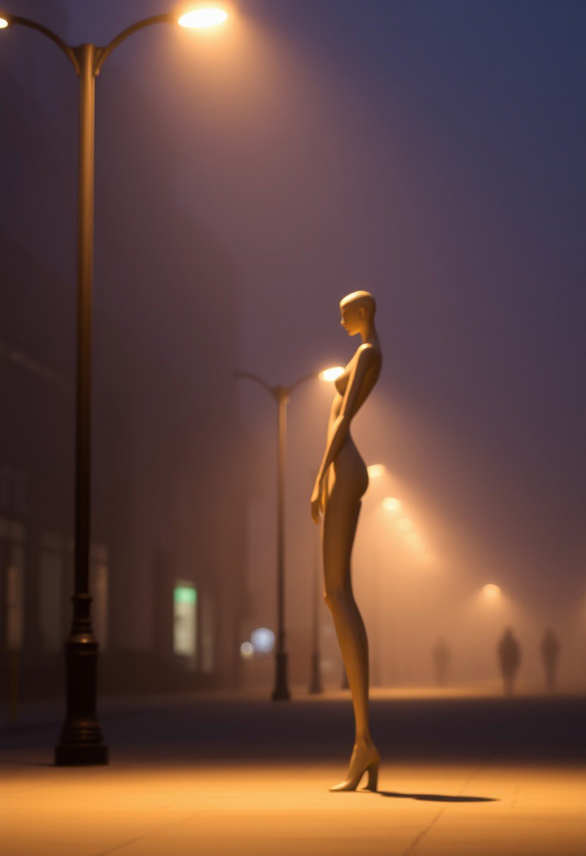 A long-exposure photograph with a blurred bokeh effect, showcasing a gently lit, elongated sculpture in an ethereal pose. A lone figure stands near dim streetlights in a foggy, misty city street scene. The image uses soft light and diffused shadows, with sharp focus on the sculpture and a soft background, capturing a contemplative mood.
