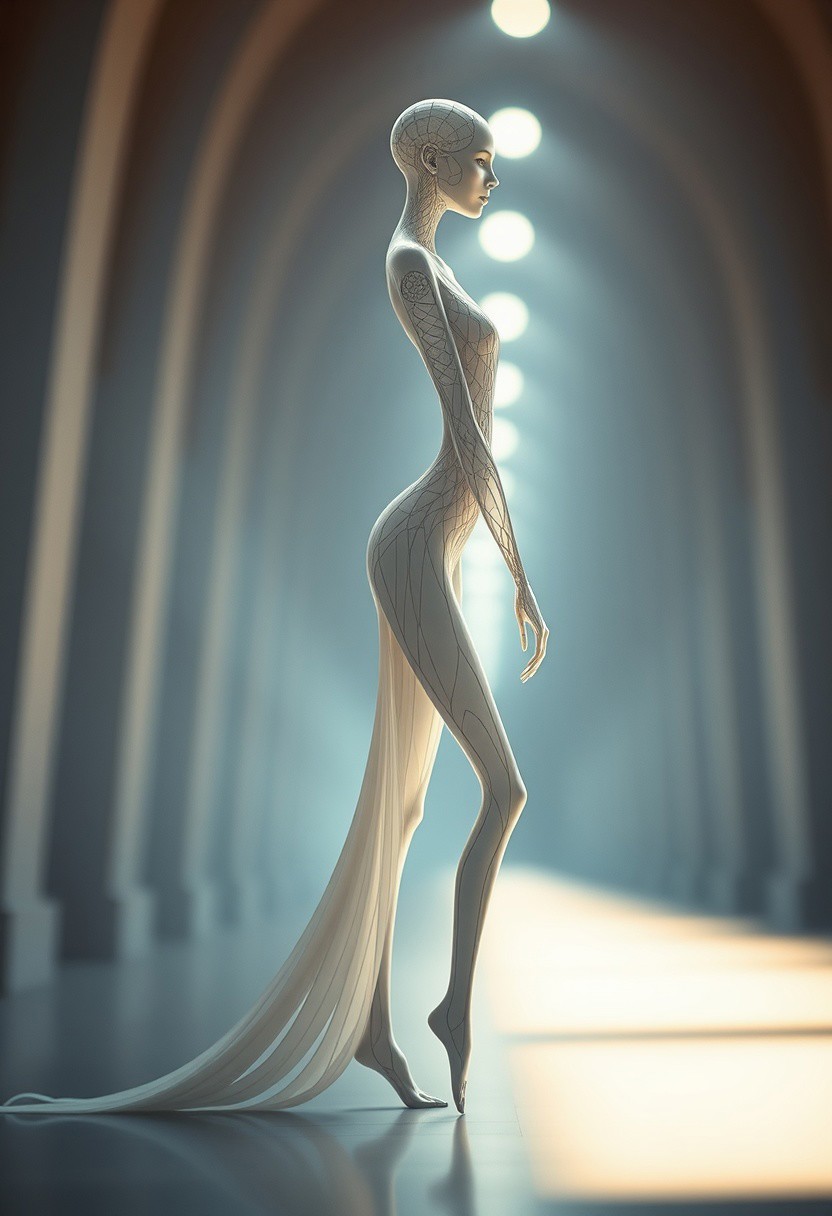Precise architectural color photograph of an elongated form in an ethereal pose, with a blurred bokeh effect and soft cinematic haze. The image features sharp lines and detailed structures of the subject against a soft-focus, hazy background, creating a balance of sharp and blurry elements.