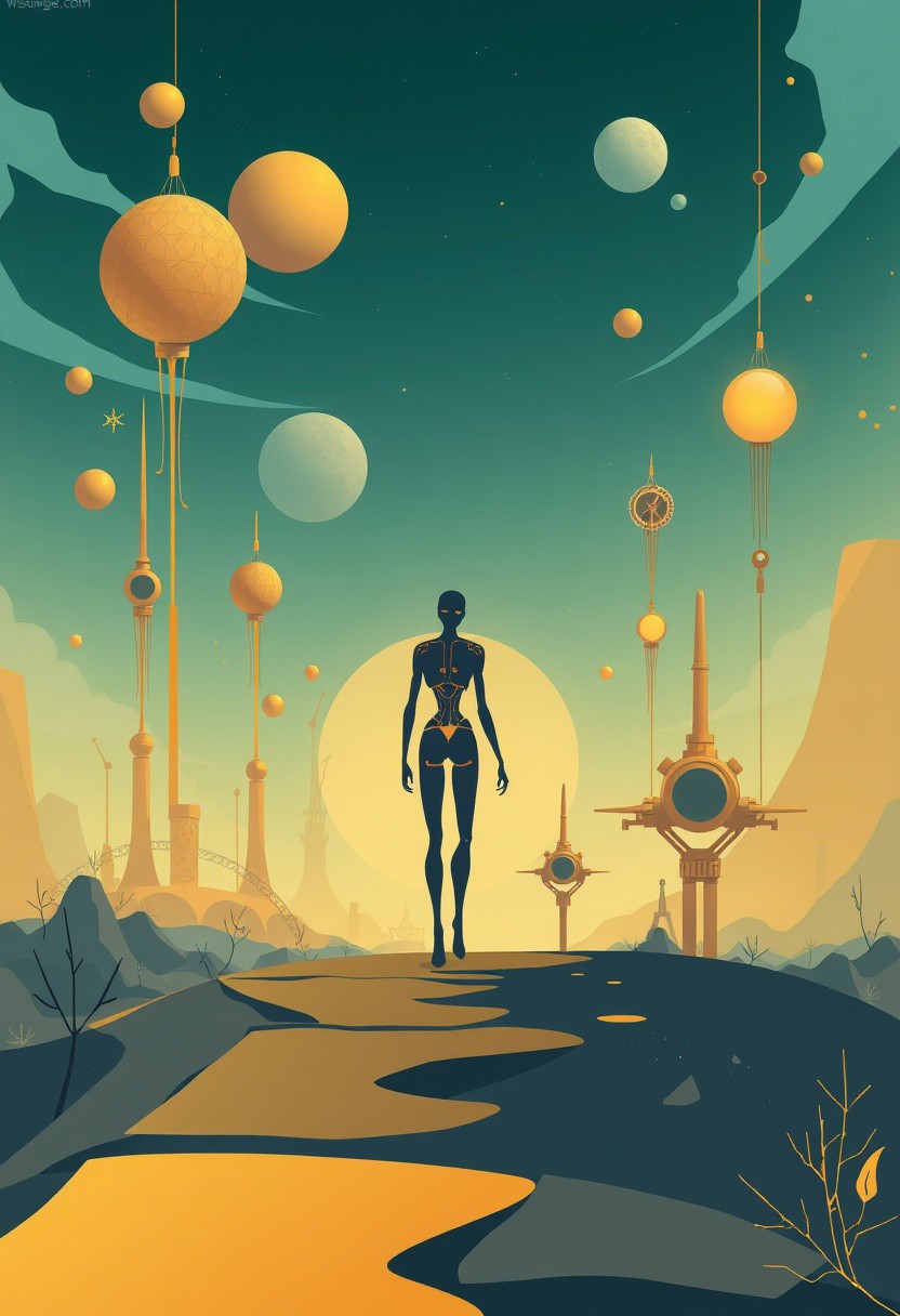 Modern flat design illustration featuring a two-dimensional, elongated human figure walking through a surreal landscape of biomechanical structures, floating spheres, and glowing orbs. Simple shapes, gold, blue, and bronze colors, infinite sky, organic and mechanical fusion.