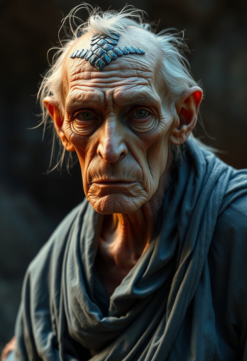 A gaunt, elderly human male with a slender, serpentine dragon tail extending from the back of his waist, donning tattered, sky blue robes that are loosely draped around his frail physique. His human face, pale with a subtle sheen of sweat, features prominent cheekbones and a forehead where dragon scales are intricately embedded, shimmering with a faint, iridescent glow. His eyes, sunken and weary, hold a deep wisdom, with a subtle sparkle of ancient knowledge. His skin, a warm, golden brown, bears the wrinkles and creases of a life well-lived, with a few scattered, wispy white hairs framing his forehead. The overall atmosphere is one of mystical, otherworldly wisdom, with the dragon tail and scales serving as a testament to his unique, fantastical heritage. Text-to-image