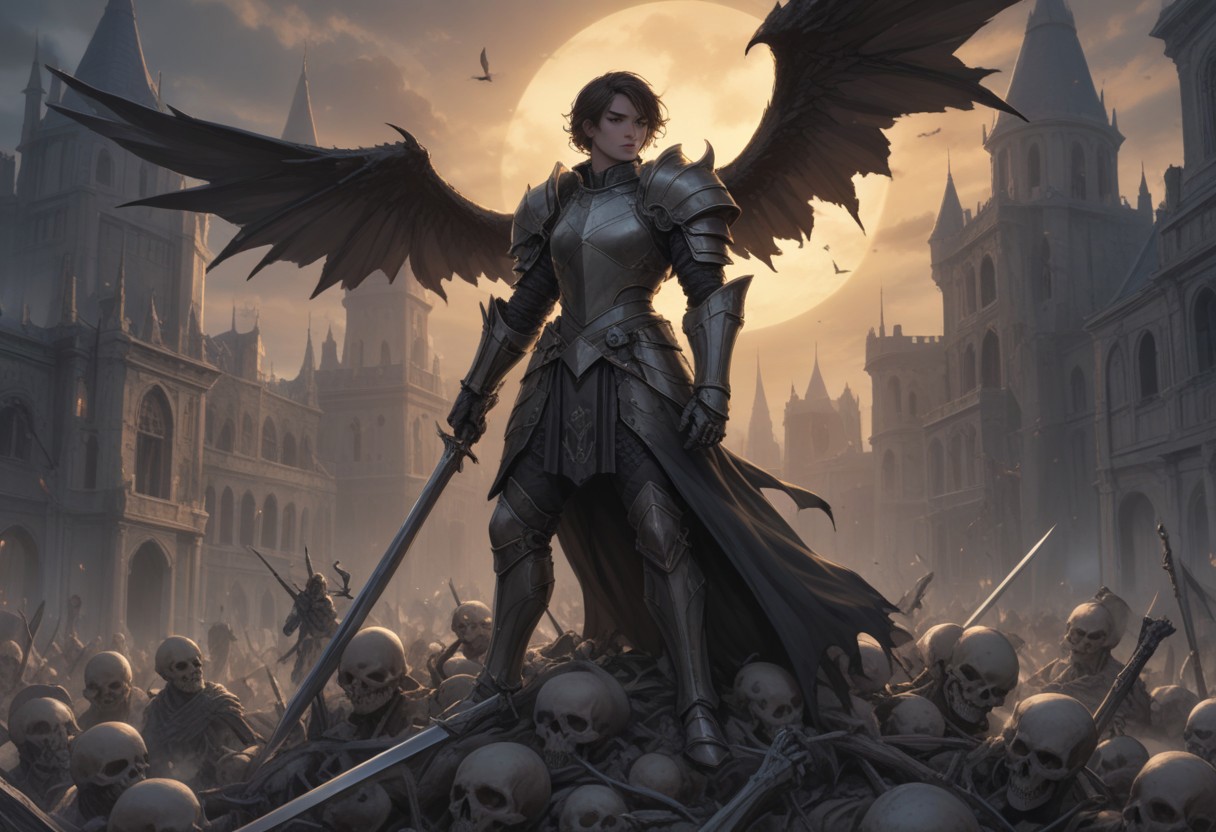 Generate a highly detailed digital matte painting of a knight in full armor, standing on a pile of skulls and bones with a large sword and a shield. The sword should have a curved blade and a pointed tip, while the armor is made of metal with intricate designs and patterns. Include a bird perched on a branch on the base. The background should feature a city in the distance with framed buildings surrounded by walls, inspired by the claymore anime style. The image should be in the style of Artgerm, Charlie Bowater, Atey Ghailan, and Mike Mignola, with vibrant colors, hard shadows, and strong rim light. Use cinematic lighting and ensure the figurine appears highly detailed. The output should be a comic cover art style image with a plain background.