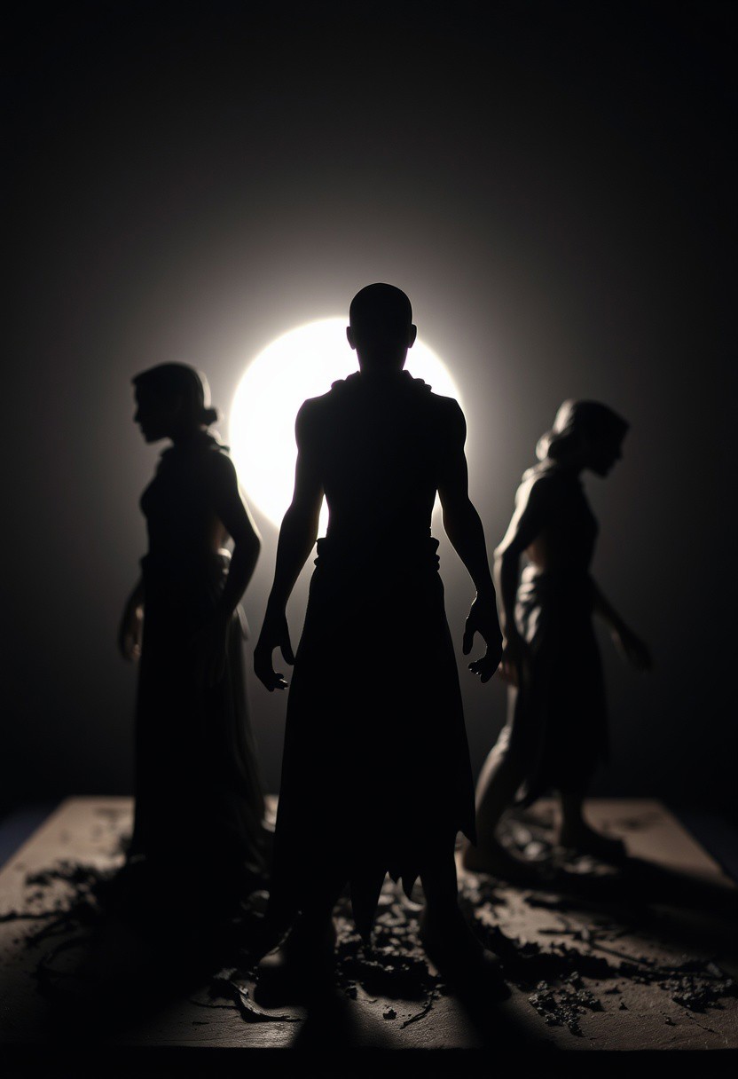 A sculptural clay art piece depicting silhouetted figures in backlighting, creating an eerie and creepy atmosphere. The cinematic composition uses dark tones, unsettling details, and a light source behind the subject to enhance the dark, gritty atmosphere. Modeled shapes and textured surfaces highlight the unsettling details.
