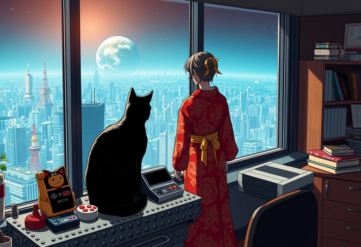 Jiji the cat from Kiki's Delivery Service sits on a cluttered metal riveted desk next to a maneki neko statue and a small Nintendo NES, Jiji is looking out of a floor to ceiling window that looks out at a very high view from an apartment on the 150th floor of a futuristic Tokyo skyscraper, the year is 2150, (((Kiki from Kiki's Delivery Service, 20 years old, is standing next to the cat looking out at planet below))), Kiki is dressed in an ornate Japanese style bath robe. The woman's hair is messy from just waking up and tied up with a ribbon. Artistic cyberpunk, dynamic perspective, The focus is on Jiji and Kiki standing together looking out the window at the view together,