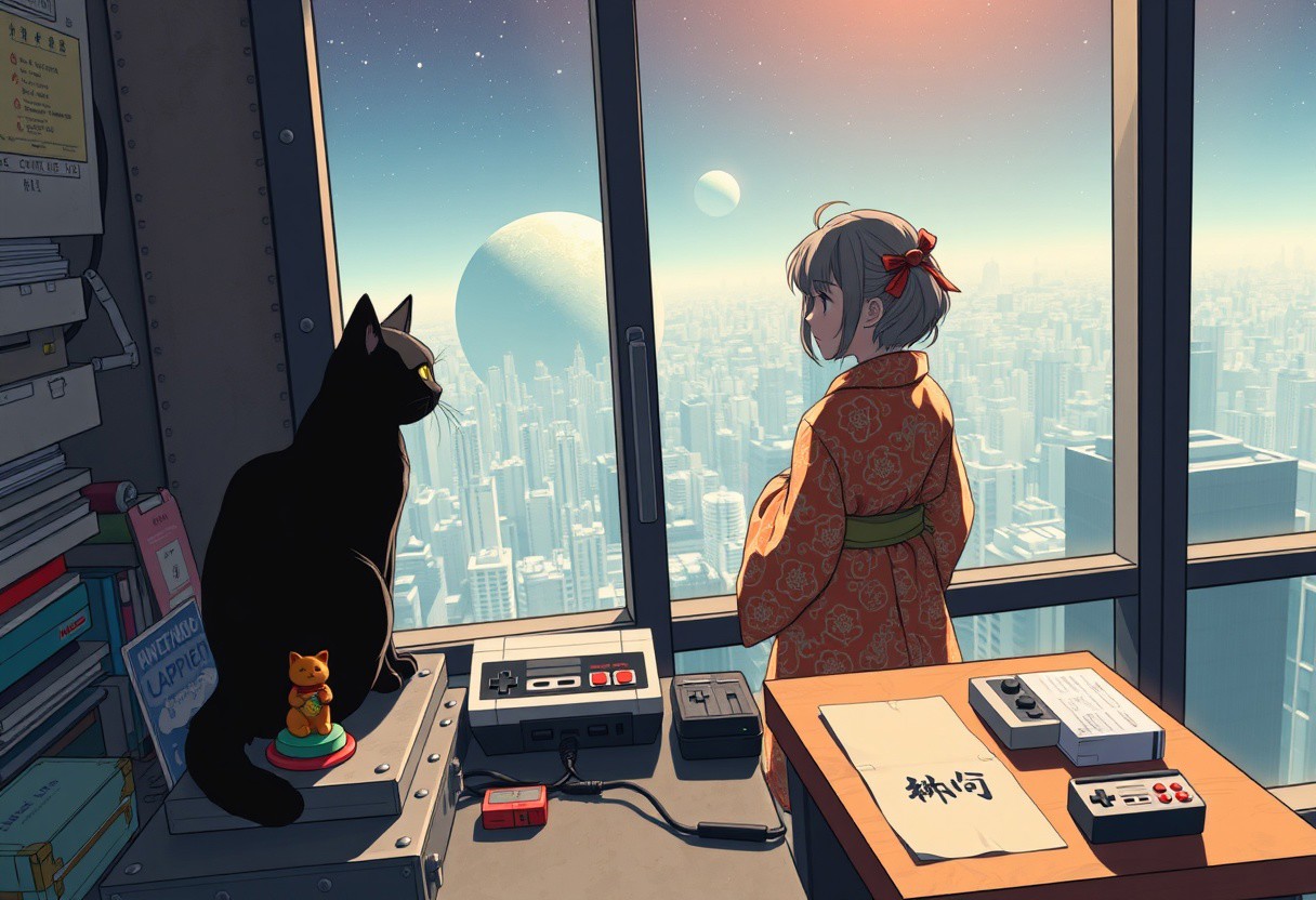 Jiji the cat from Kiki's Delivery Service sits on a cluttered metal riveted desk next to a maneki neko statue and a small Nintendo NES, Jiji is looking out of a floor to ceiling window that looks out at a very high view from an apartment on the 150th floor of a futuristic Tokyo skyscraper, the year is 2150, (((Kiki from Kiki's Delivery Service, 20 years old, is standing next to the cat looking out at planet below))), Kiki is dressed in an ornate Japanese style bath robe. The woman's hair is messy from just waking up and tied up with a ribbon. Artistic cyberpunk, dynamic perspective, The focus is on Jiji and Kiki standing together looking out the window at the view together,