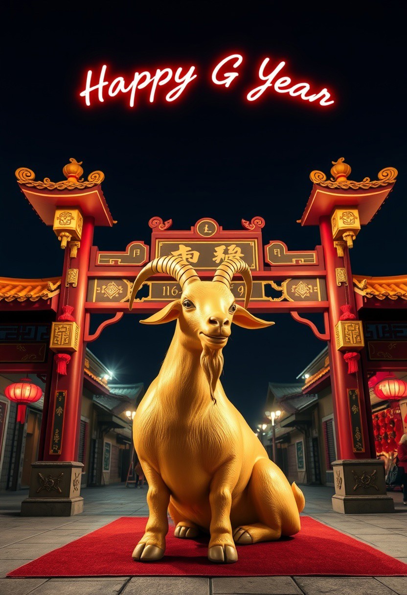 pinkchibisnakeyear, A golden goat sitting around a traditional Chinese archway decorated with red and gold accents. Above the gate, "Happy Goat Year" glows brightly in the night sky.