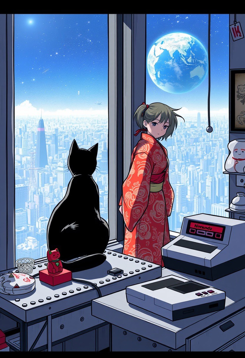 Jiji the cat from Kiki's Delivery Service sits on a cluttered metal riveted desk next to a maneki neko statue and a small Nintendo NES, Jiji is looking out of a floor to ceiling window that looks out at a very high view from an apartment on the 150th floor of a futuristic Tokyo skyscraper, the year is 2150, (((Kiki from Kiki's Delivery Service, 20 years old, is standing next to the cat looking out at planet below))), Kiki is dressed in an ornate Japanese style bath robe. The woman's hair is messy from just waking up and tied up with a ribbon. Artistic cyberpunk, dynamic perspective, The focus is on Jiji and Kiki standing together looking out the window at the view together,
