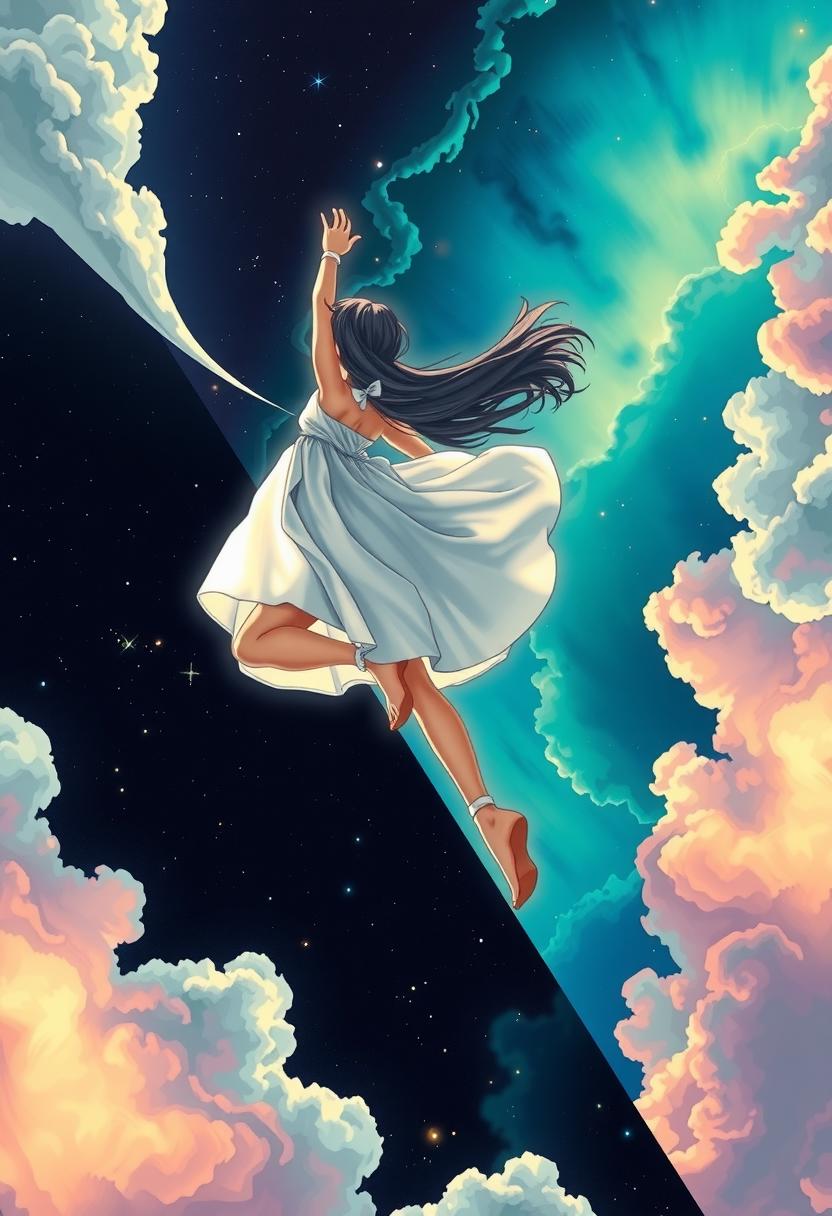 In the style of kilian eng, vibrant colours, Hyper detailed, realisic digital painting, illustration, neo surrealism, chris saunders. neon outline, dmt trip. An anime girl in a white dress leaping upward into the sky, view from below.. The image is split diagonally, with another view of a nebula, green and blue gaseous clouds.