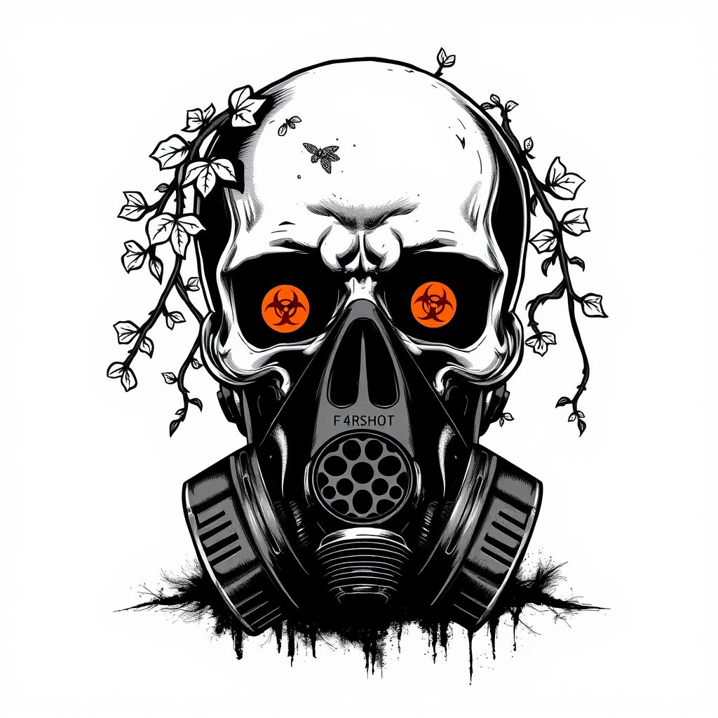 Skull, gas mask, biohazard logos on the mask, Vines, black and white silhouette, Looking like it's fading away, the word F4RSH0T